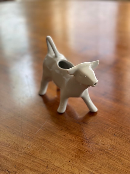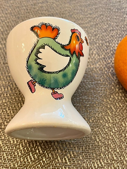 Vintage eggeglass med motiv av høne og ku. Porselen