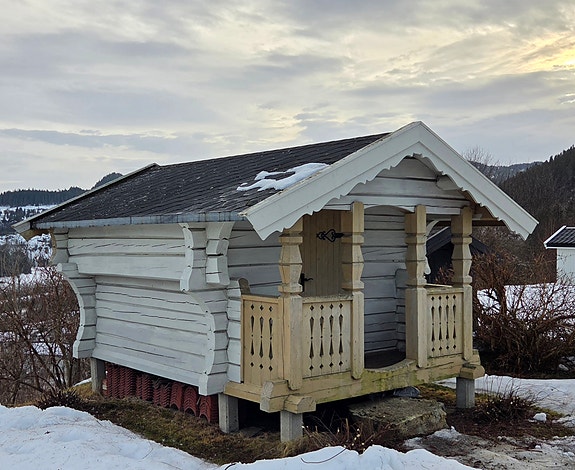 Laftet stabbur / bod med veranda – svært god stand – kan demonteres