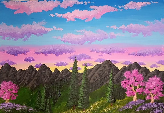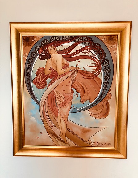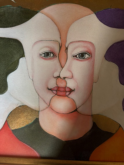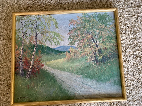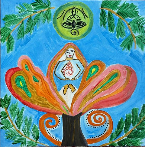 Fargerikt maleri med kvinnefigur og naturmotiv