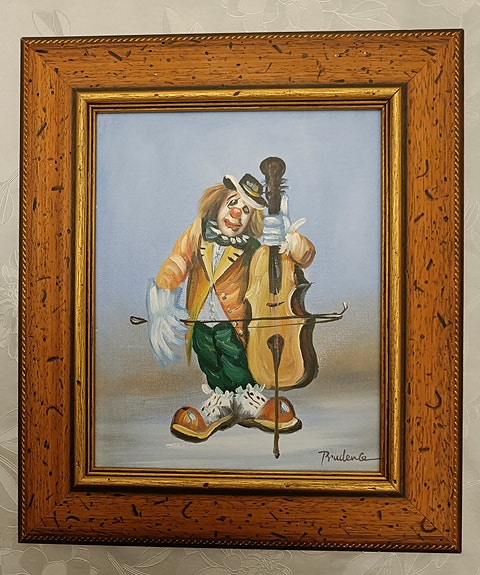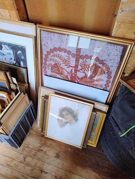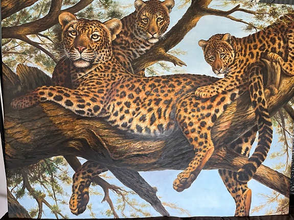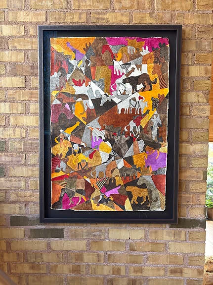 Fargerikt maleri/kollasje med dyremotiv i ramme