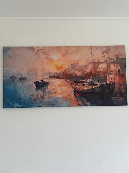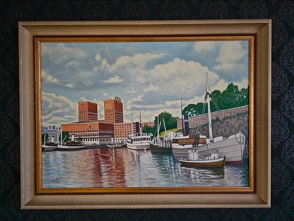 Originalt maleri av Oslo Rådhus og havneliv – signert Th. A – 60 × 80 cm