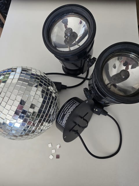 Retro diskoball-sett fra 80-tallet – kule, motor og 2 pinspots