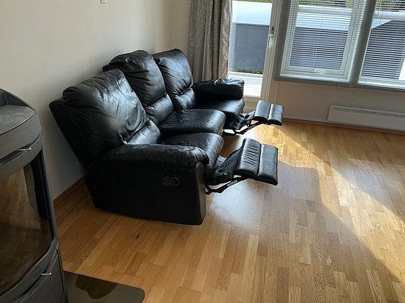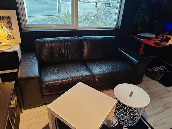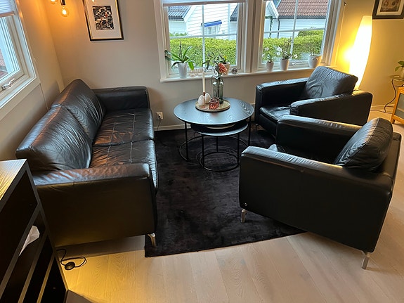 Sort skinnsofa 2 + 3 seter og pall