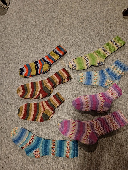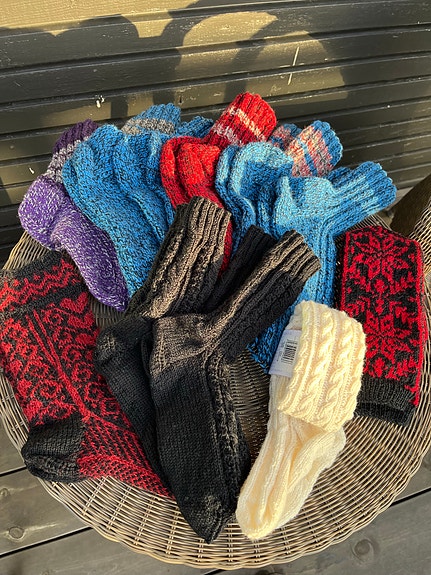 7 par hjemmestrikket ullsokker/ raggsokker samlet.