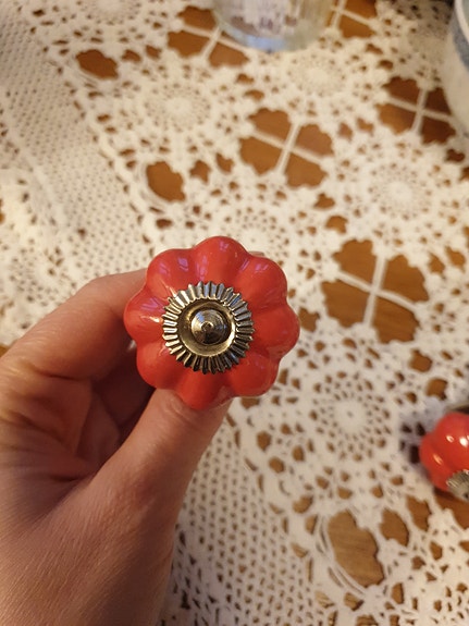 4 røde retro knotter i porselen til kommode e.l.