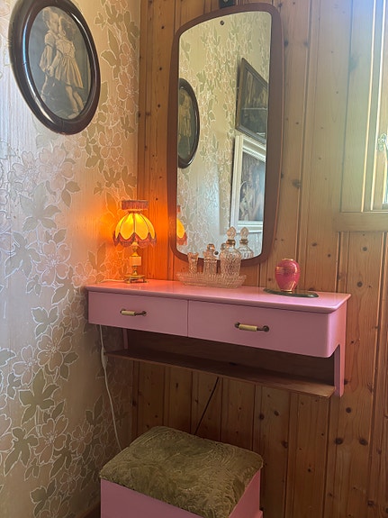 Retro rosa sminkesett m/speil, kommode og puff