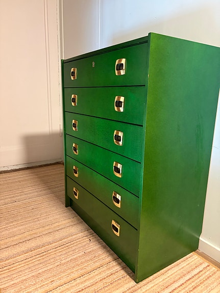 Unik retro kommode i dyp skoggrønn med stilige gullfargede håndtak