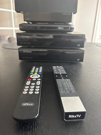 Diverse dekodere og fjernkontroller fra Altibox, RiksTV , Arris, Strong