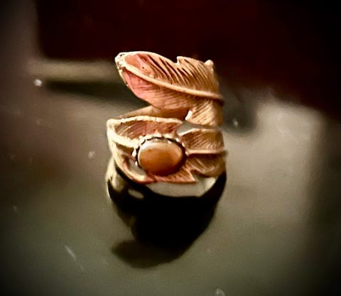 Nydelig gullfarget ring |fjør | tiger stein