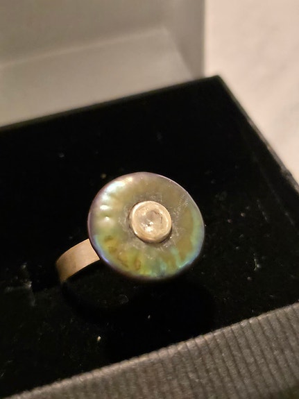 Ring i sølv 925 med grønnlig kulturperle og hvit Safir.