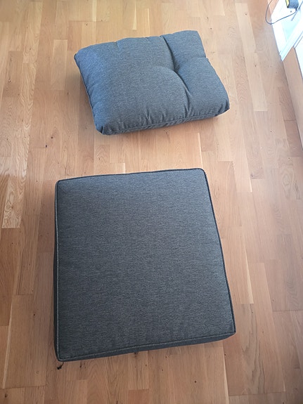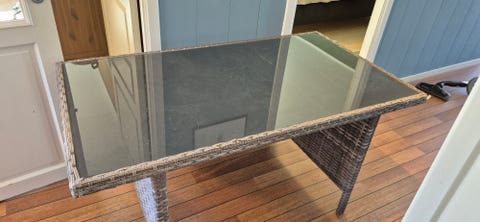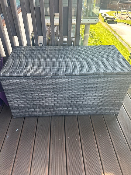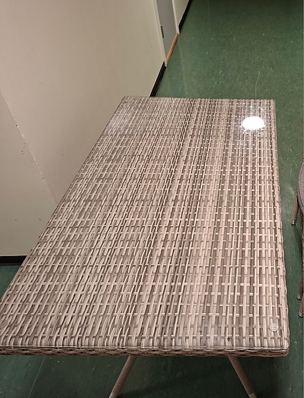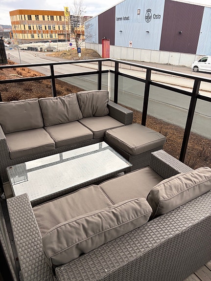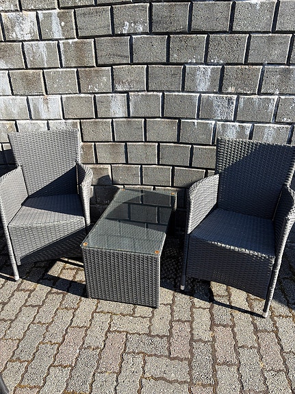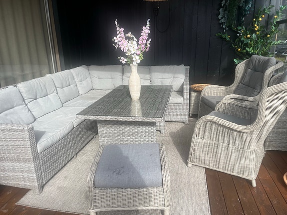 Hagemøbelsett med to sofaer, puff og glassbord i grå rotting