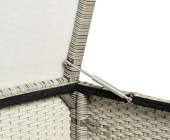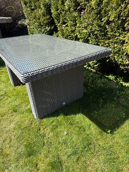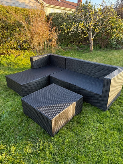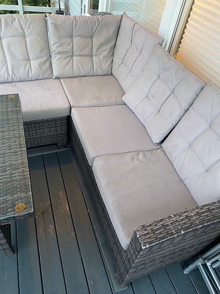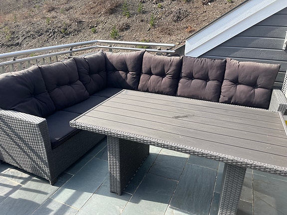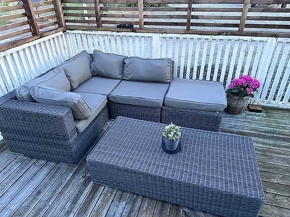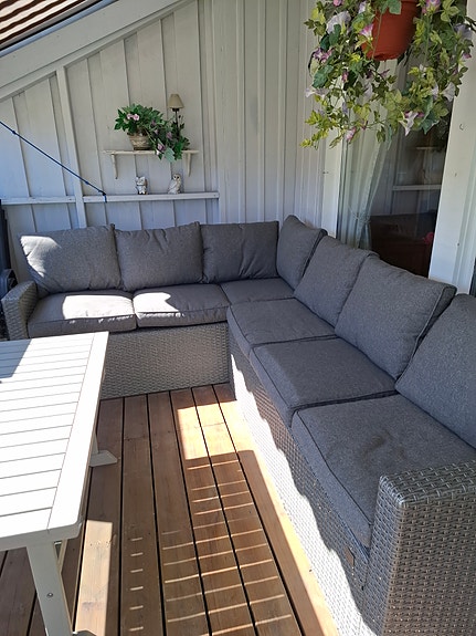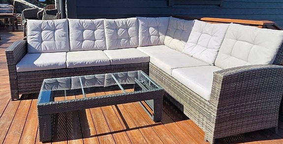 Hagesofa hjørnesofa med stoler og bord i grå rotting