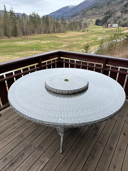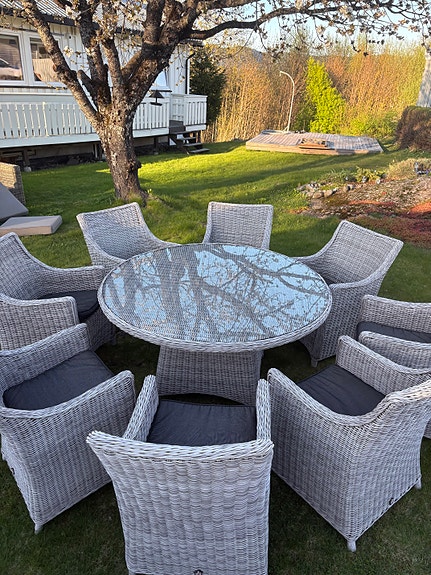 Rund hagegruppe i rotting med 8 stoler og puter grå