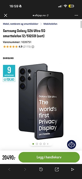 15 998 krSamsung Galaxy S26 Ultra 5G smarttelefon 12/512GB (sort) 512 GB SamsungMjølkeråen3 dg.Legg til som favoritt.Åpne annonse