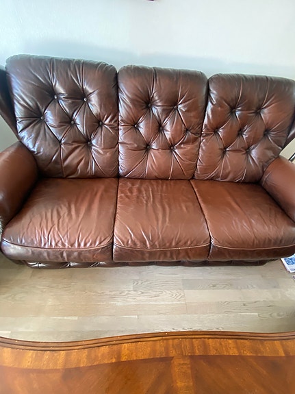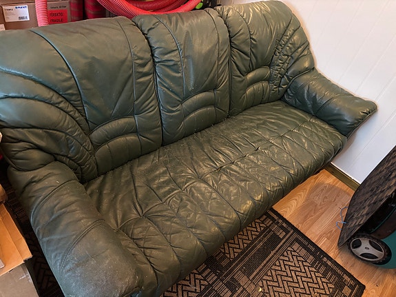 Sofa og lenestol i skinn gis bort