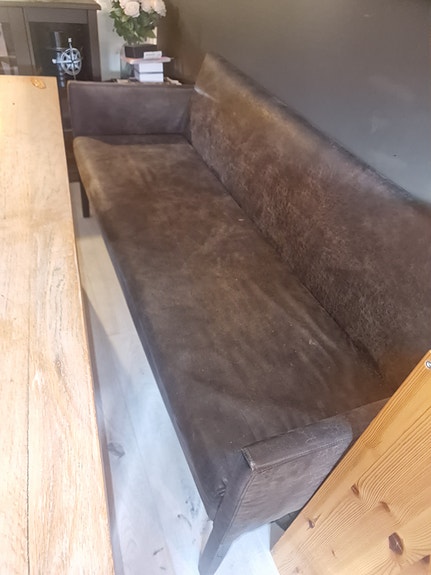 Spisesofa i mørk brunt skinn.