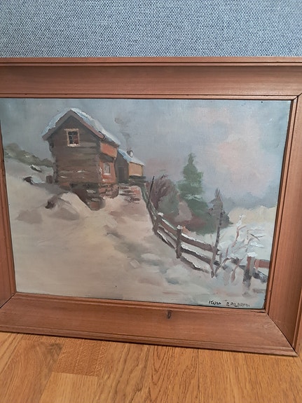 KARLH 1932 maleri vinterlandskap med hytte og stabbur