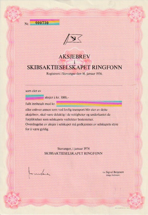 Aksjebrev Skibsselskapet Ringfonn -STAVANGER 1974 - ( SIGVAL BERGERSEN)