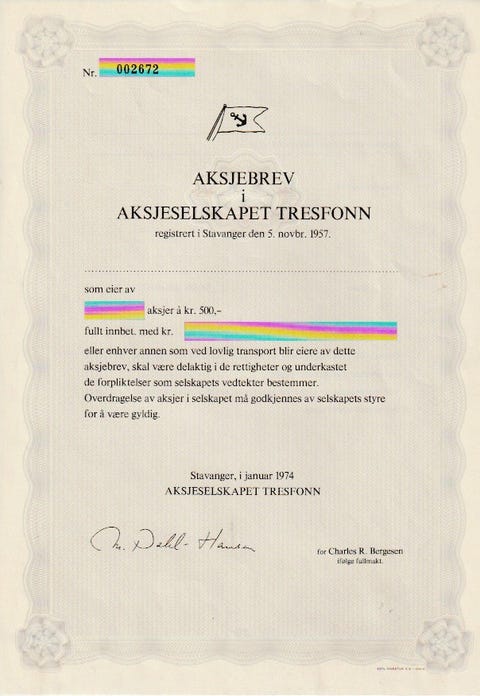 Aksjebrev i Aksjeselskapet Tresfonn- STAVANGER 1974 8 Charles R. Bergesen
