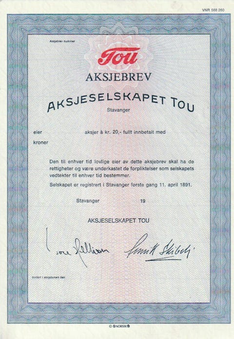 Aksjebrev Aksjeselskapet Tou Stavanger 19- Blankett.