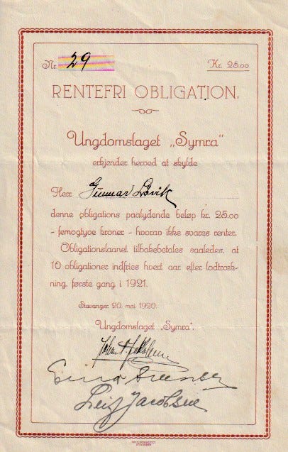 Gammel rente obligasjon «Ungdomslaget Symra» Stavanger 1920