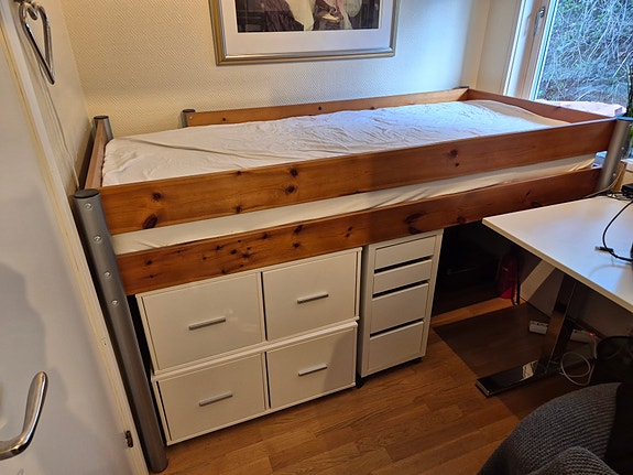 Høy seng 90x200 cm med stige og god madrass + overmadrass