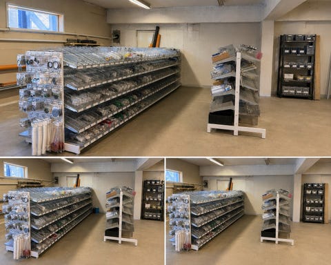 Praktiske lagringsstativ, transportstativ og gitterbur for stillas selges