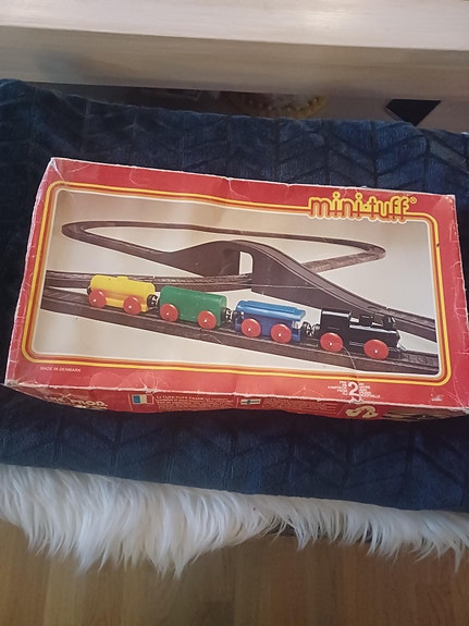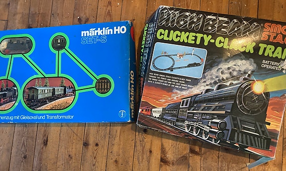 vintage Blikktog togbane med lokomotiv, vogner og skinner