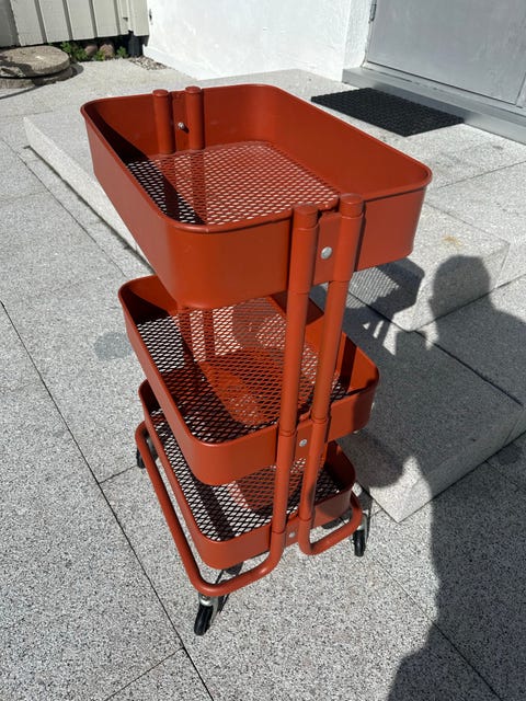 Rusta trillevogn med 3 hyller rustrød