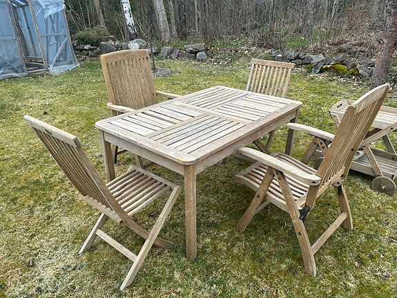 Teak hagemøbler bord 4 stoler og trillevogn Teak Garden
