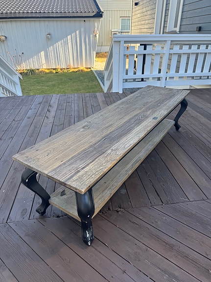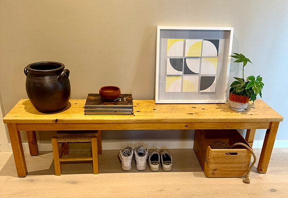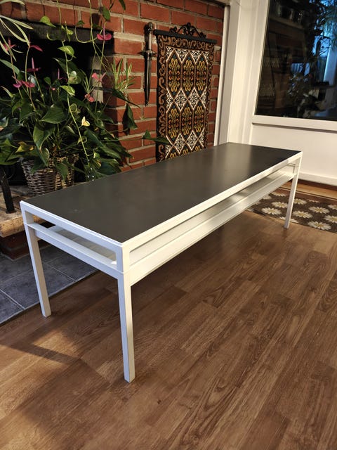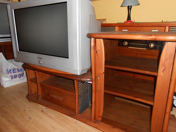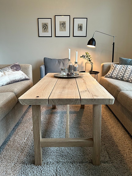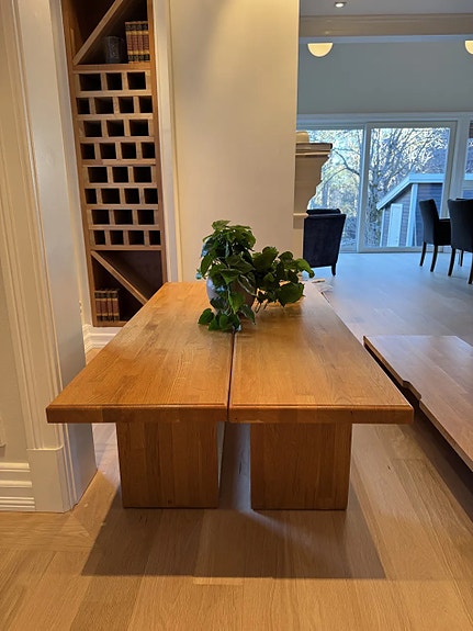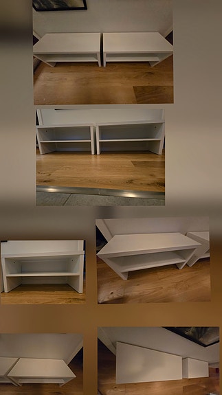 2 benker(kan brukes som bord) + TV-bord i heltre eik – selges samlet