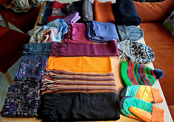 Vareparti av flotte nesten ubrukte skjerf, hansker/votter og luer.