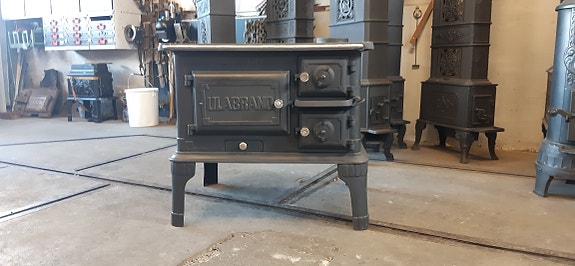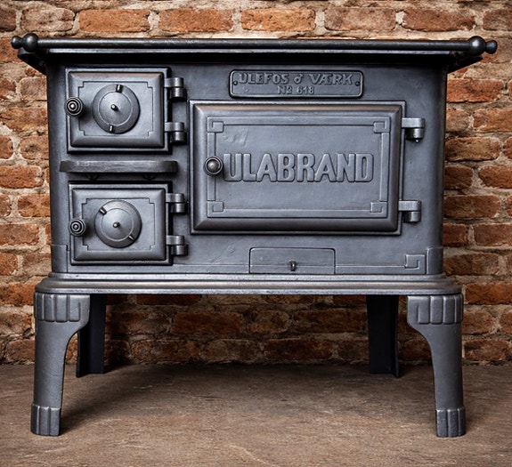 Vedkomfyr i støpejern fra Ulabrand type 719 fra Ulefos Jernværk. Årsmodell 1920