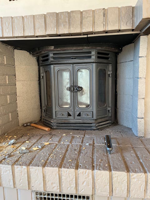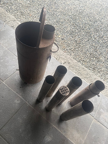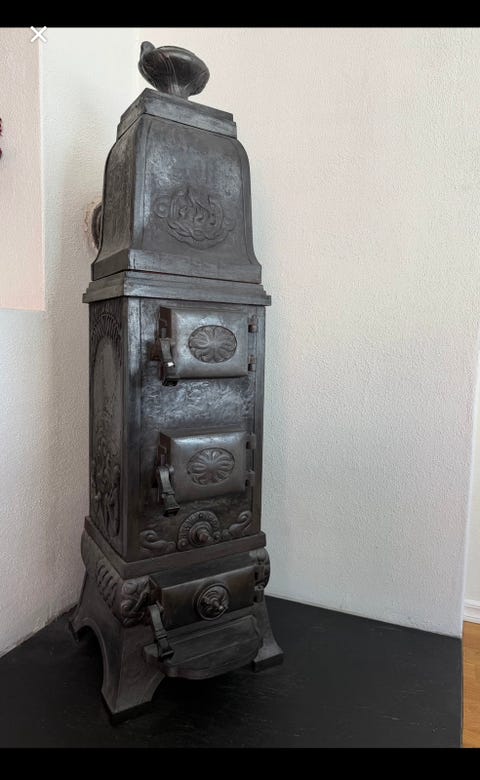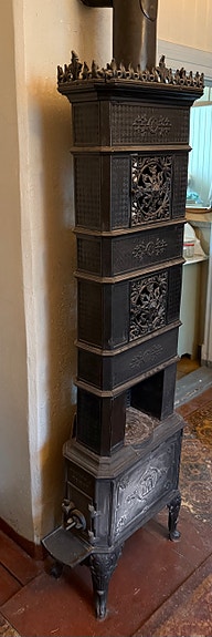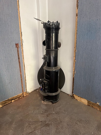 Gammel vedovn med rør og innsatser i metall