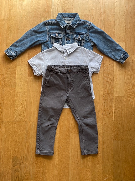 Wheat, Mango pakke med jeansjakke, jeans og skjorte, st. 98, samlet 200kr