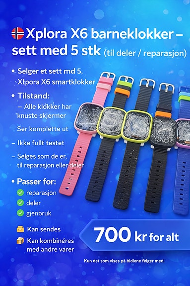#154 - Selger et sett med 5 stk Xplora X6 smartklokker for barn.