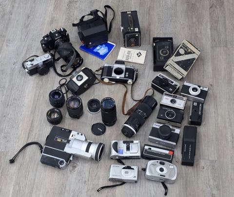 Lot med gamle kamera og linser