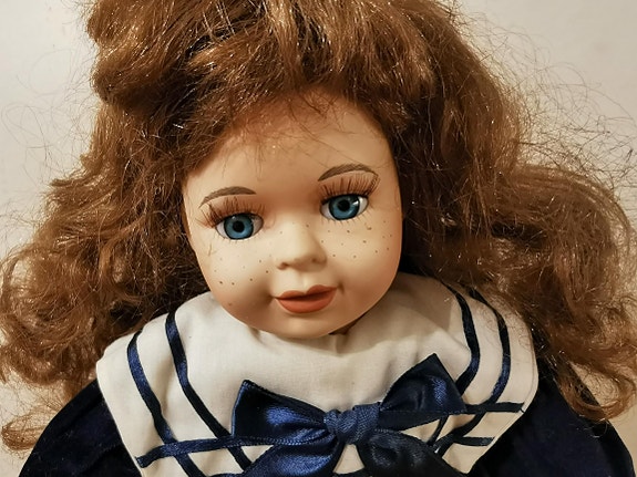 Søt porselendukke på stativ