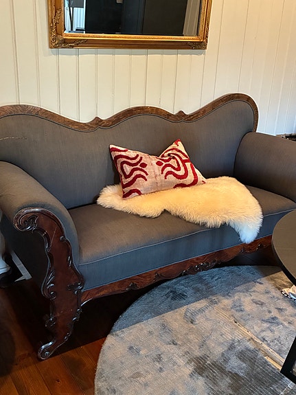 Sofa i klassisk stil treverk og rødt velurstoff