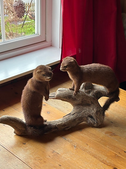 Utstoppede mink på drivvedstokk