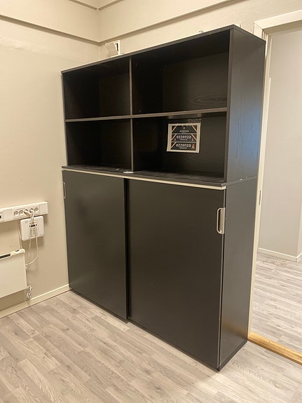 Mørk kontorreol med skyvedører og åpne hyller. IKEA. Haster